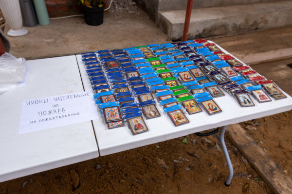 Перед входом в недостроенный храм иконы Божией Матери «Споручница грешных» стоит прихожанка. Перед ней на столе небольшие иконки в полиэтилене и от руки написанное объявление “Иконы уцелевшие от пожара. На пожертвование”. “Всю субботу разгребали пепелище, – говорит она, – порядок наводили, вот иконы обнаружили. Сохранились. Представляете?! Не это ли чудо?”.