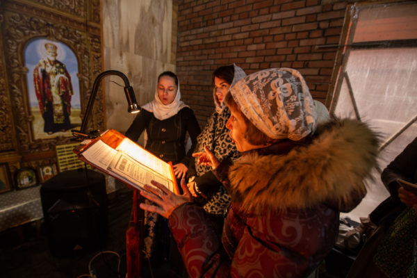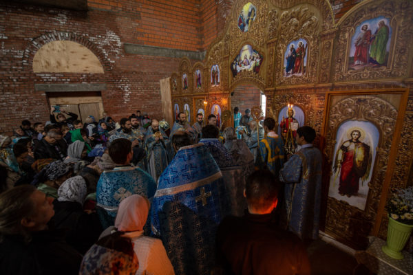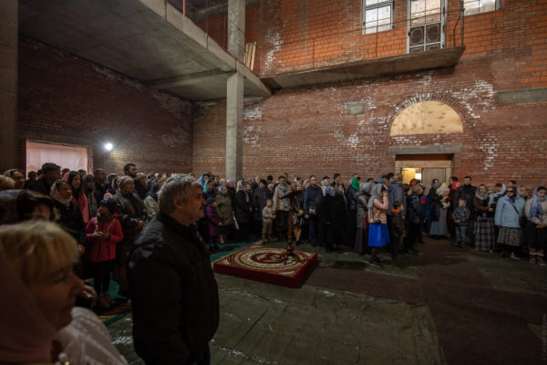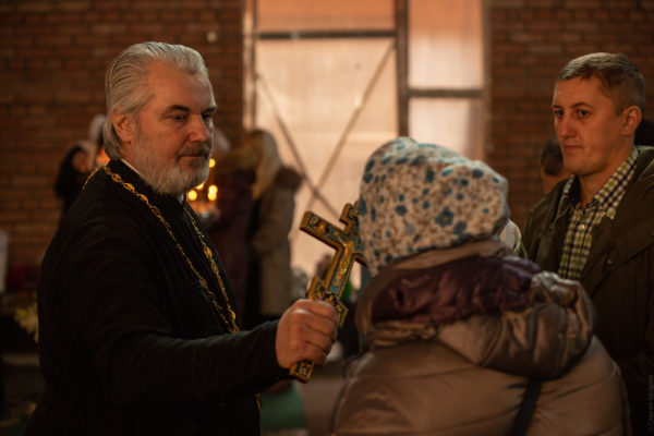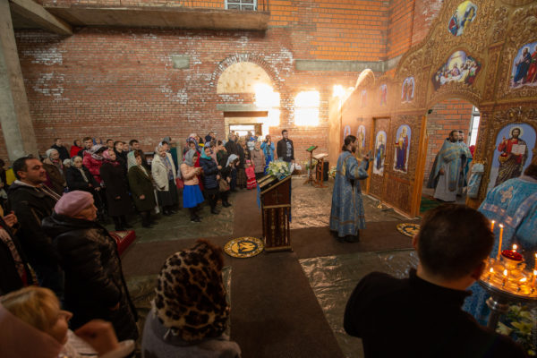 Большой и неотапливаемый храм затянут пленкой и строительными лесами. Бетонный пол застлан полиэтиленом и офисным ковровыми дорожками, но даже так ноги мерзнут. И только хору, который очень старается в этот праздничный день, специально поставили масляный обогреватель. Кирпичные стены по периметру храма, как поясом украшены именами: Екатерина, Анна, Мария, Фотиния, Вячеслав. Где-то именные пометки чёрным маркером сильно выше человеческого роста: Владимир, Нина, Олег, Василий, Татьяна. Даже стены алтаря украшены не фресками, они здесь будут еще очень нескоро, а исписаны сотнями имён тех, для кого этот храм – дом Божий.