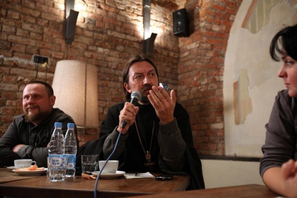 Главный редактор журнала «Русский репортер» Виталий Лейбин сразу посетовал на то, что дискуссия, возможно, будет несколько односторонней, потому что найти людей которые бы озвучили вопросы, которые с удивительным постоянством возникают, например, в интернет-обсуждениях и при этом соответствовали бы по уровню представителям Церкви – не нашлось. Впрочем, оппоненты из аудитории со своей задачей справились, вопросы, которые они задавали, вполне соответствовали репликам на форумах — у церковных спикеров и недоумевающих вопрошателей появилась редкая возможность посмотреть в глаза своим «идеологическим противникам».