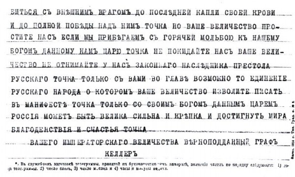 « – Я получил депешу, – сказал граф Келлер, – об отречении Государя и о каком-то Временном правительстве. Я, ваш старый командир, деливший с вами и лишения, и горести, и радости, не верю, чтобы государь император в такой момент мог добровольно бросить на гибель армию и Россию. Вот телеграмма, которую я послал царю (цитирую по памяти): «3-й конный корпус не верит, что ты, государь, добровольно отрекся от престола. Прикажи, царь, придем и защитим Тебя».