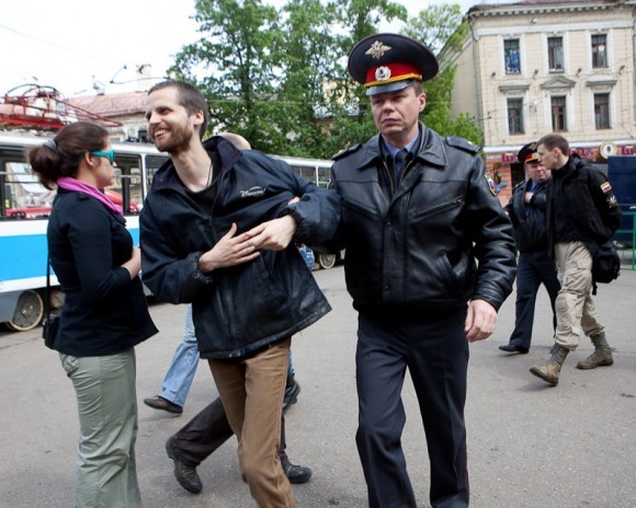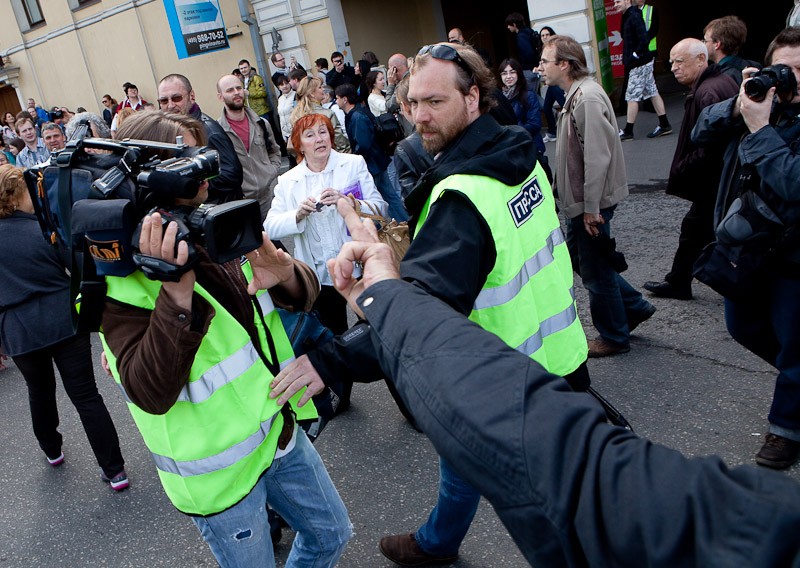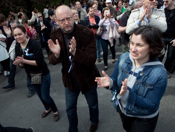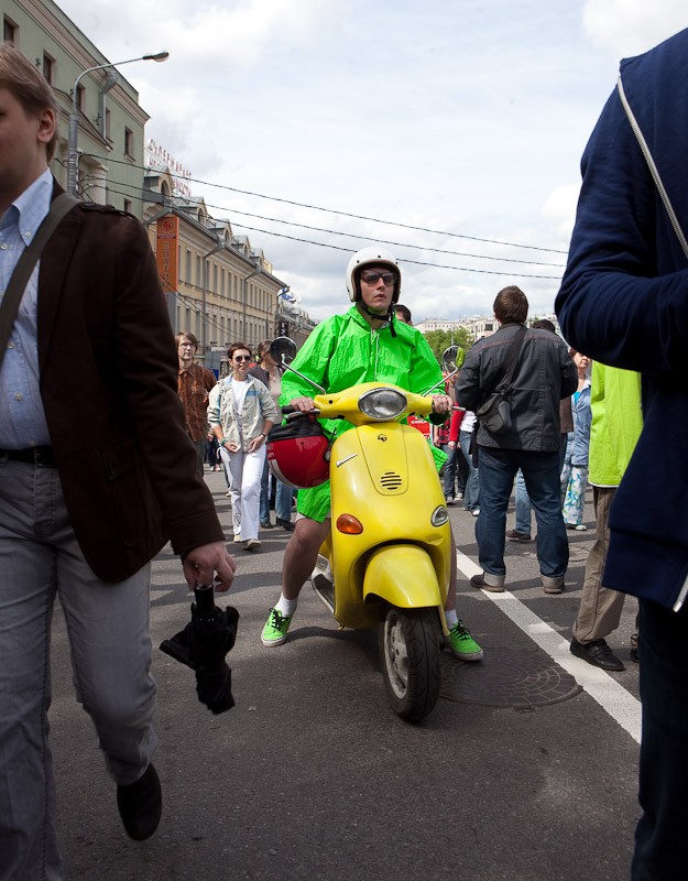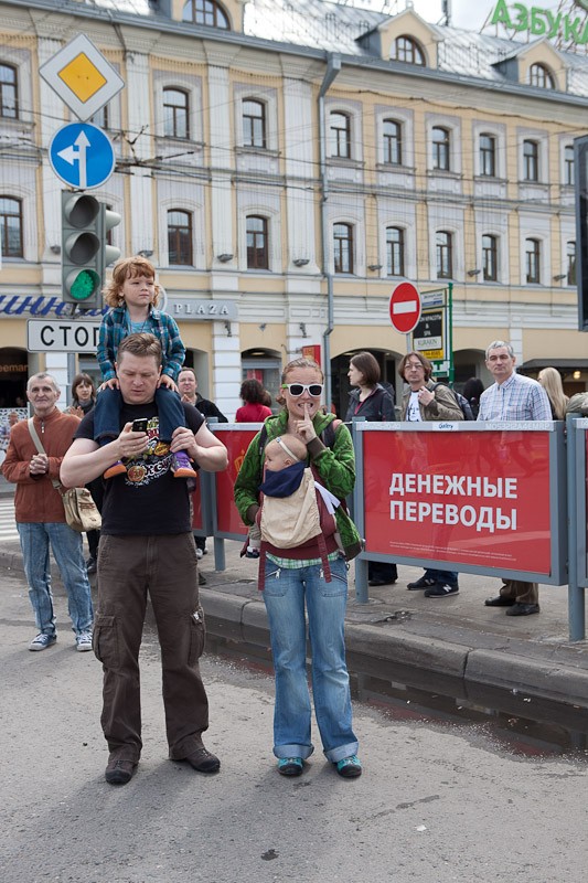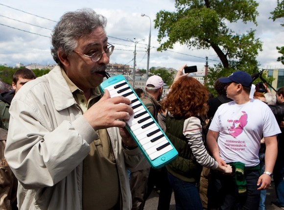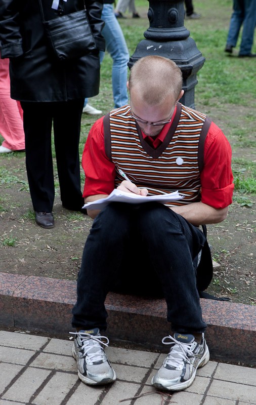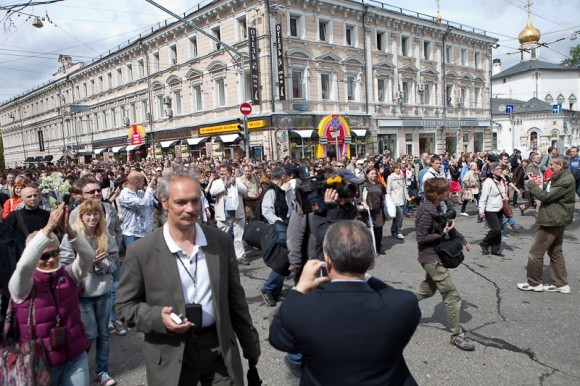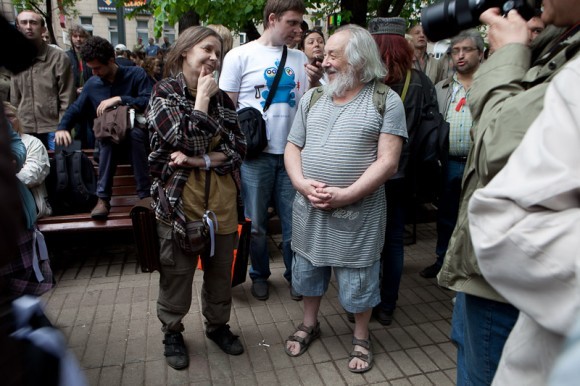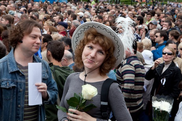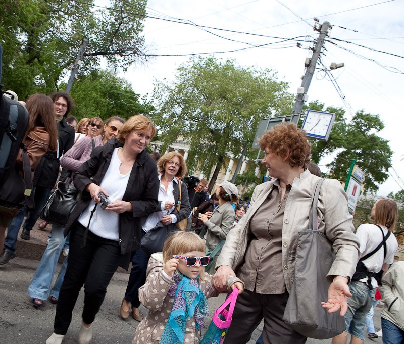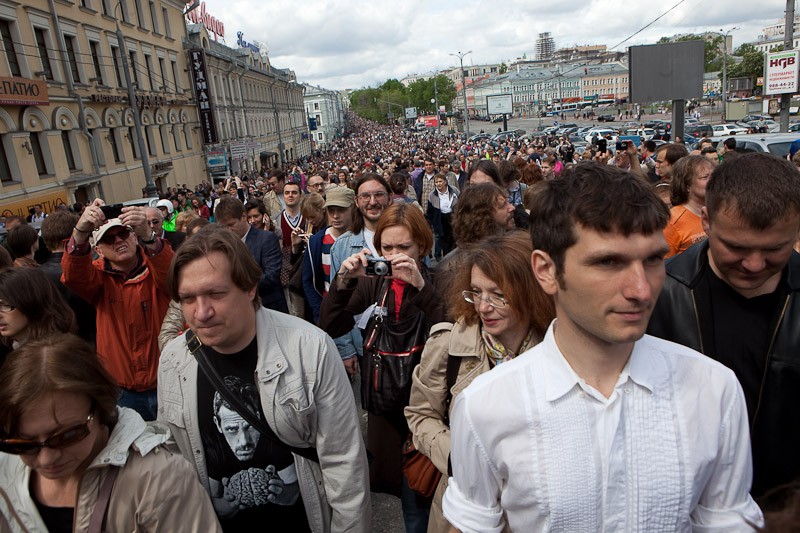 Действительно, абсолютно ничего агрессивного, провокационного или хотя бы странного в поведении гуляющих не было. Один-единственный раз демонстранты освистали съемочную группу телеканала НТВ, но ничего подобного событиям 6 мая (тогда машину НТВ закидали мусором) не было. «Несогласная интеллигенция» дошла до памятника Грибоедову, где состоялось единственное в ходе акции вмешательство в происходящее полиции (был задержан молодой человек, скандировавший почему-то «Гей-парад не пройдет»), пообщалась между собой и с любимыми авторами, желающие прогулялись чуть дальше, до оппозиционного лагеря «Occupy Абай» (бессрочная акция протеста вокруг памятника Абаю Кунанбаеву на Чистых прудах — несколько десятков человек живут на бульваре, общаются, поют песни и не выдвигают политических требований; вчера к протестантам присоединился человек с коровой на поводке — нам корову встретить не удалось) — после чего начали медленно рассасываться по окрестным кафешкам.