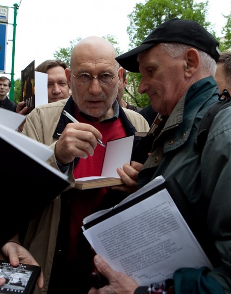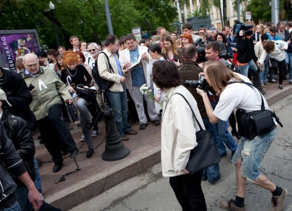 Поэт и писатель Дмитрий Быков тем временем раздавал автографы за памятником в окружении многочисленных камер — прессы, как происходит в последнее время на всех общественных акциях, поначалу было не меньше, чем участников.