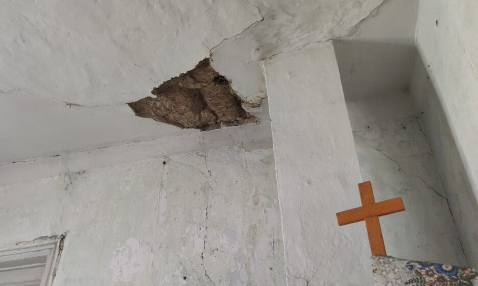 Удручающее впечатление производит состояние трапезной — потолок частями уже обвалился и грозит обвалиться полностью. А в той части здания, где хранятся дрова для печи, стены рушатся на глазах, в буквальном смысле слова.