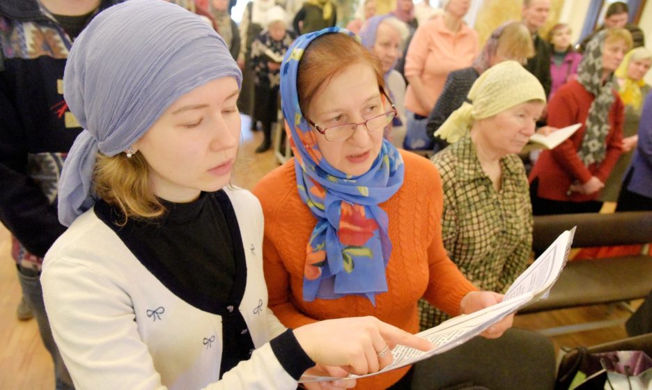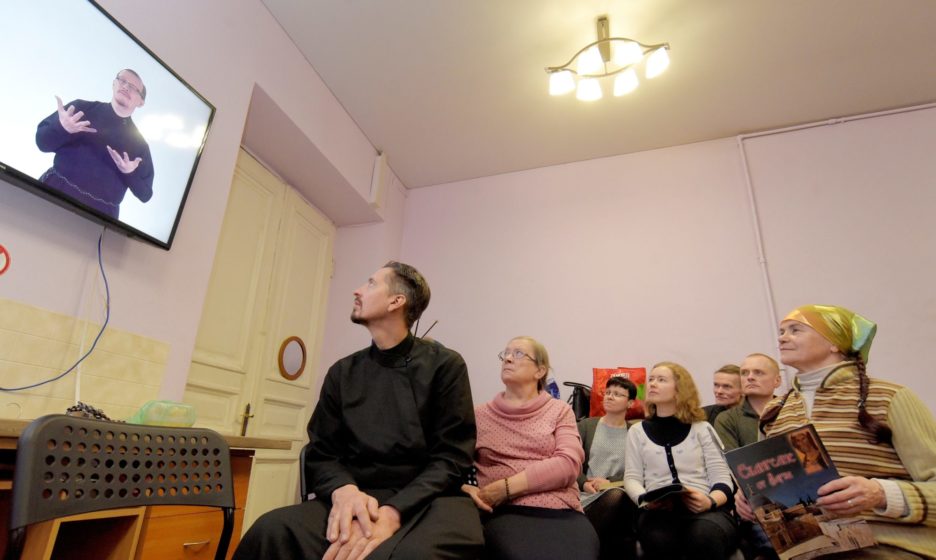 Община неслышащих после трапезы в своем помещении занимается изучением Священного Писания. Люди сидят полукругом и смотрят два видеоперевода фрагмента Евангелия от Марка. Одно видео подготовлено отцом Павлом Афанасьевым, слабослышащим диаконом из Московской области. Другое — Российским библейским обществом. В какой-то момент собравшиеся начинают сильно жестикулировать. Внутри жестового языка есть вариативность, и какой-то жест, видимо, оказался не слишком точным. Тон общению задают: алтарник прихода Александр Миронов — инвалид по слуху, заочно окончивший семинарию, мастер спорта, тренер петербургской команды глухих по волейболу. И Марина Меграбова, преподаватель воскресной школы. Она была среди тех, кто начинал эту общину.