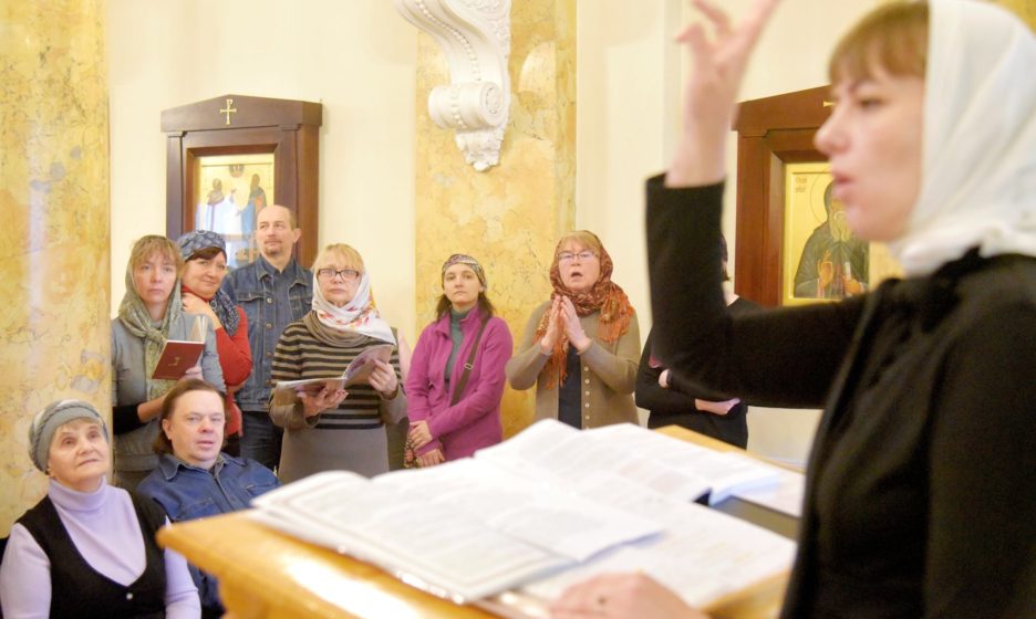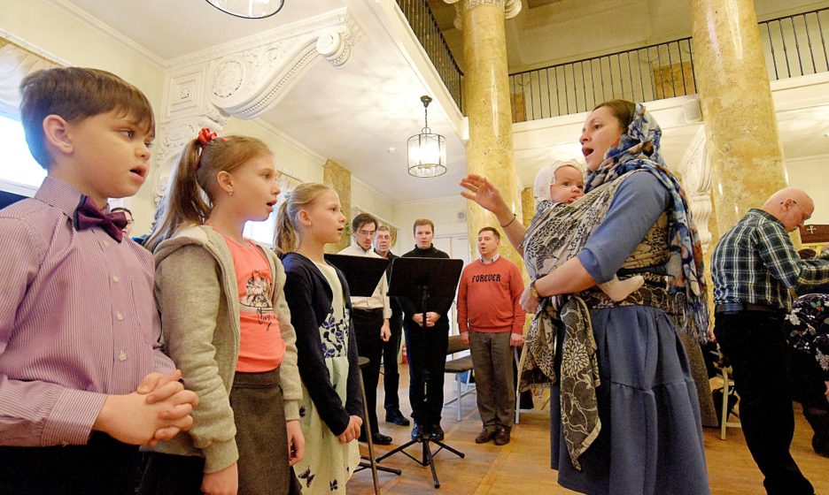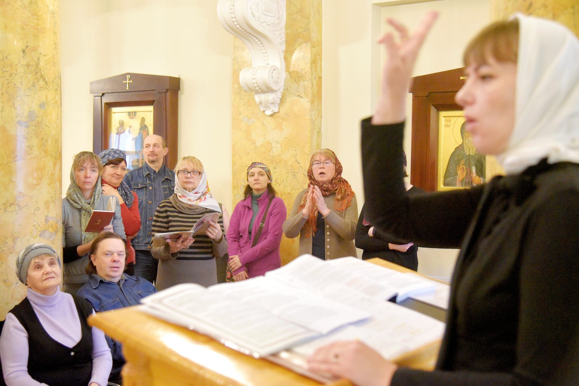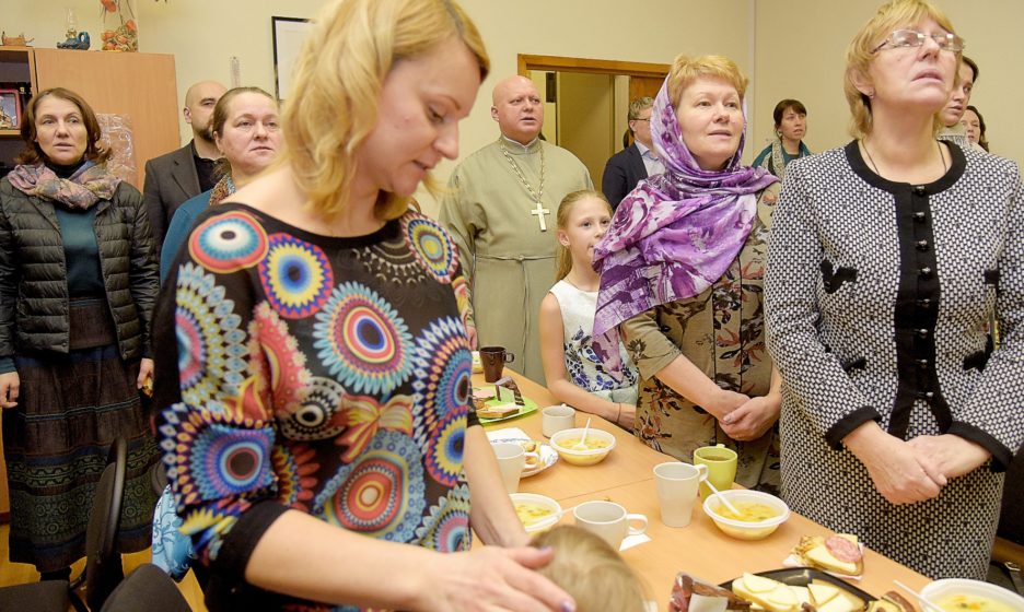 До начала Литургии самое оживленное место в приходе Петропавловского храма — большая трапезная. У окна в углу перед фортепиано распевается народный хор, в противоположном, кухонном уголке на двух электрических плитках в больших кастрюлях закипает вода под суп. Прихожане поодиночке и группами расположились за длинными столами в ожидании службы.