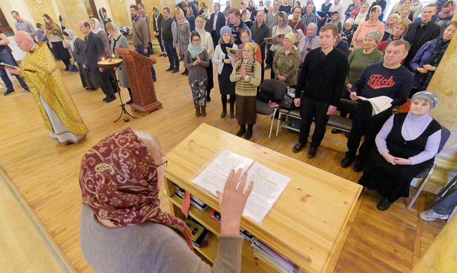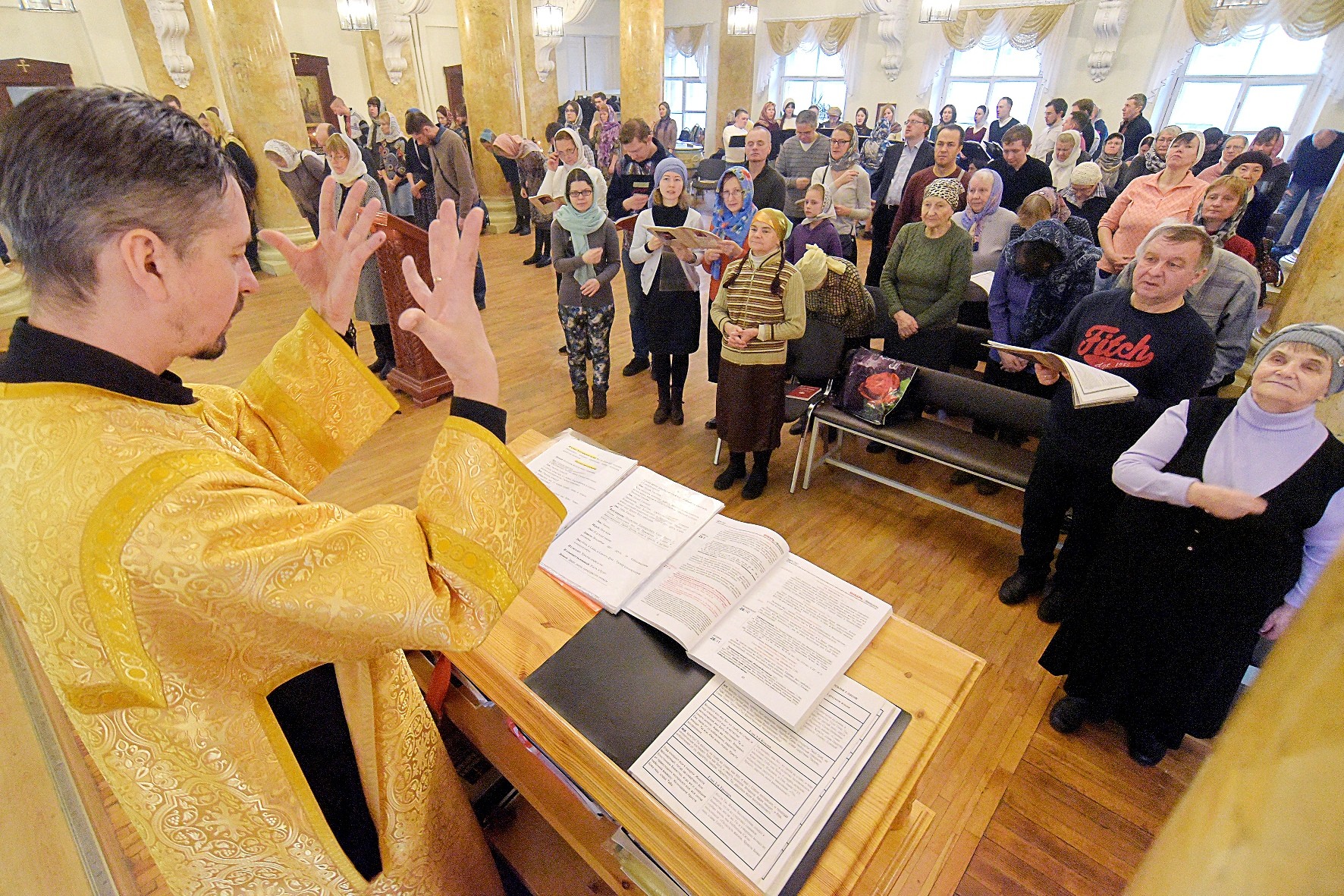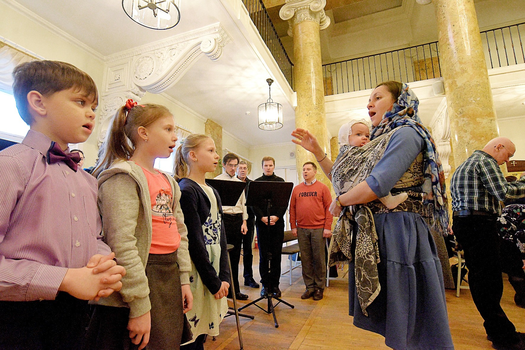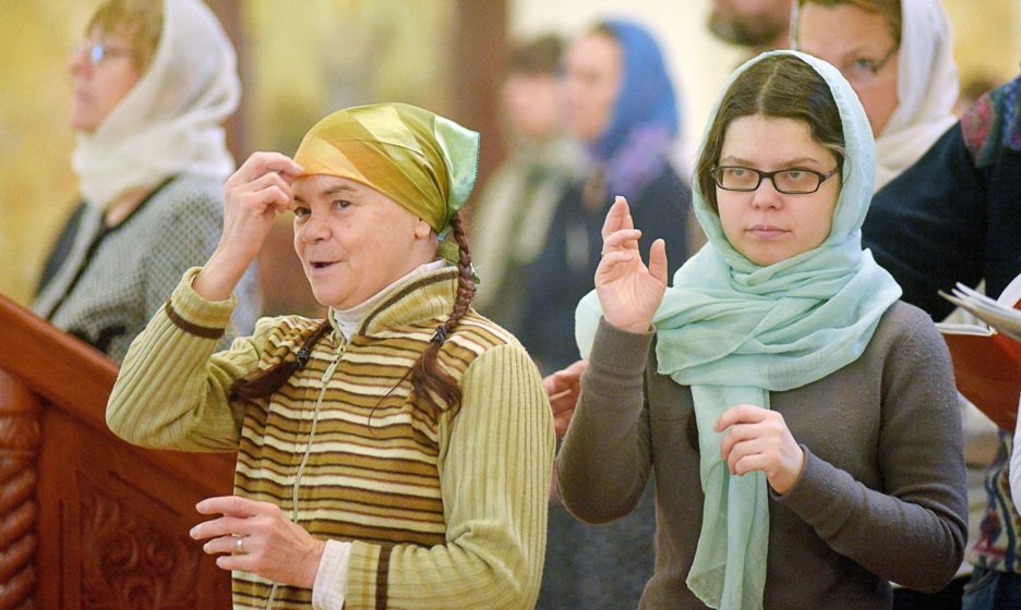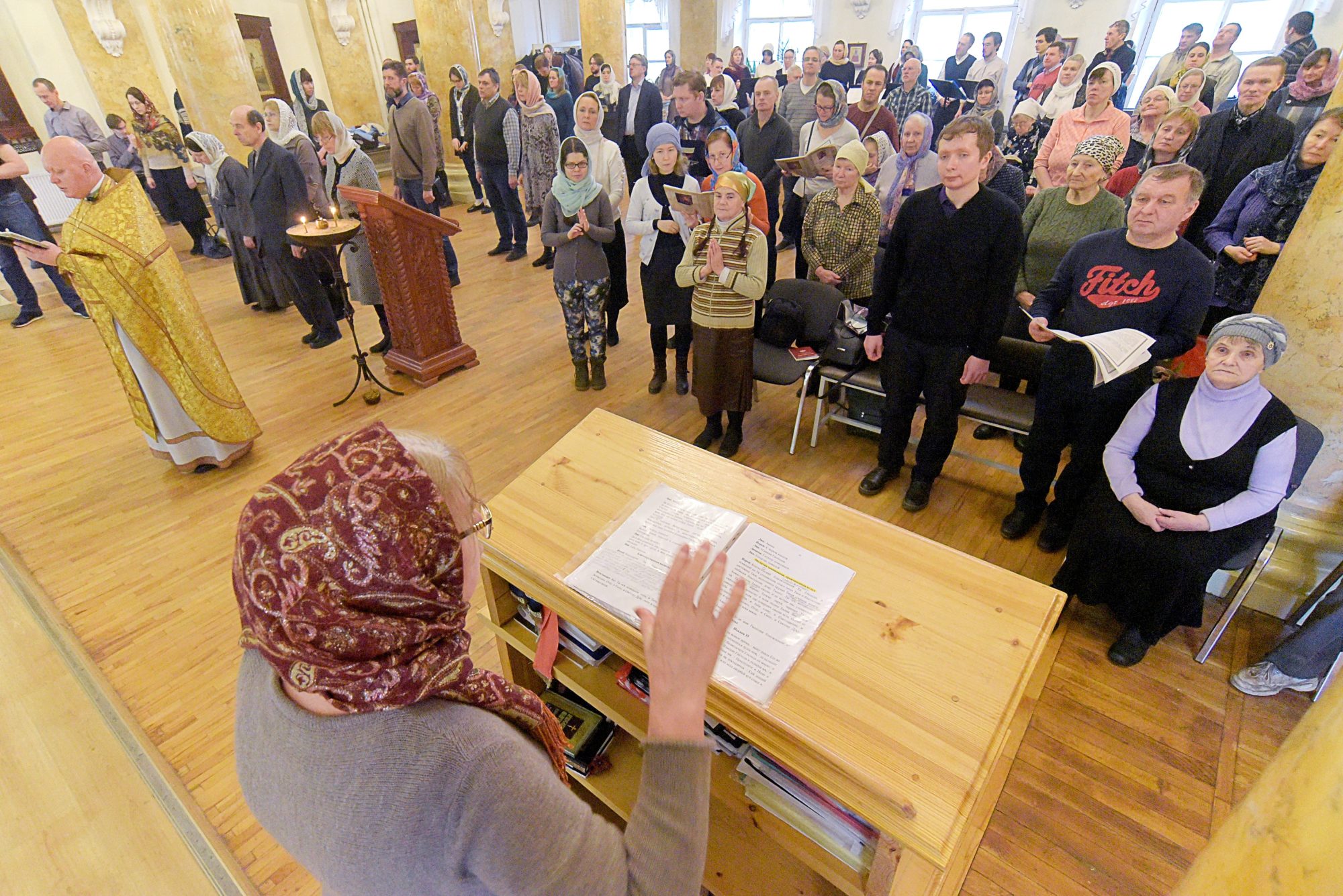 Община неслышащих после трапезы в своем помещении занимается изучением Священного Писания. Люди сидят полукругом и смотрят два видеоперевода фрагмента Евангелия от Марка. Одно видео подготовлено отцом Павлом Афанасьевым, слабослышащим диаконом из Московской области. Другое — Российским библейским обществом. В какой-то момент собравшиеся начинают сильно жестикулировать. Внутри жестового языка есть вариативность, и какой-то жест, видимо, оказался не слишком точным. Тон общению задают: алтарник прихода Александр Миронов — инвалид по слуху, заочно окончивший семинарию, мастер спорта, тренер петербургской команды глухих по волейболу. И Марина Меграбова, преподаватель воскресной школы. Она была среди тех, кто начинал эту общину.