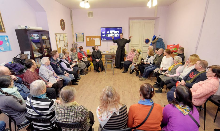 На первом этаже двадцатого корпуса — мастерская Марии Кирилловны Лавровой, заслуженной артистки России, актрисы и режиссера БДТ. Недавно ее ученики вместе с глухими прихожанами снялись в социальных роликах, которые создает другая прихожанка, руководитель и режиссер киностудии «Жираф» Ольга Шульгина. К приходу периодически присоединяется кто-то из студентов или сотрудников университета, начинающий свой путь в Церковь. Словом, здесь постоянное движение, и в то же время настоятель отстаивает право прихода быть особым миром.