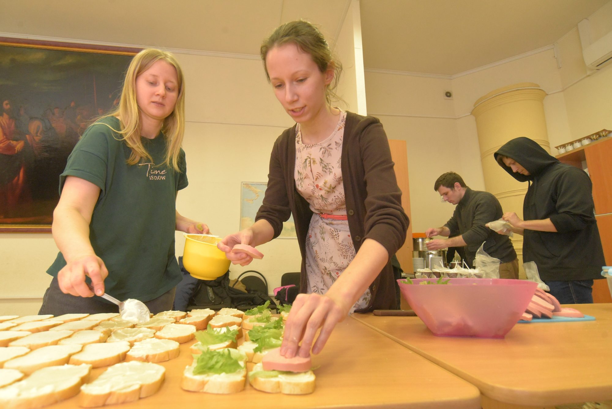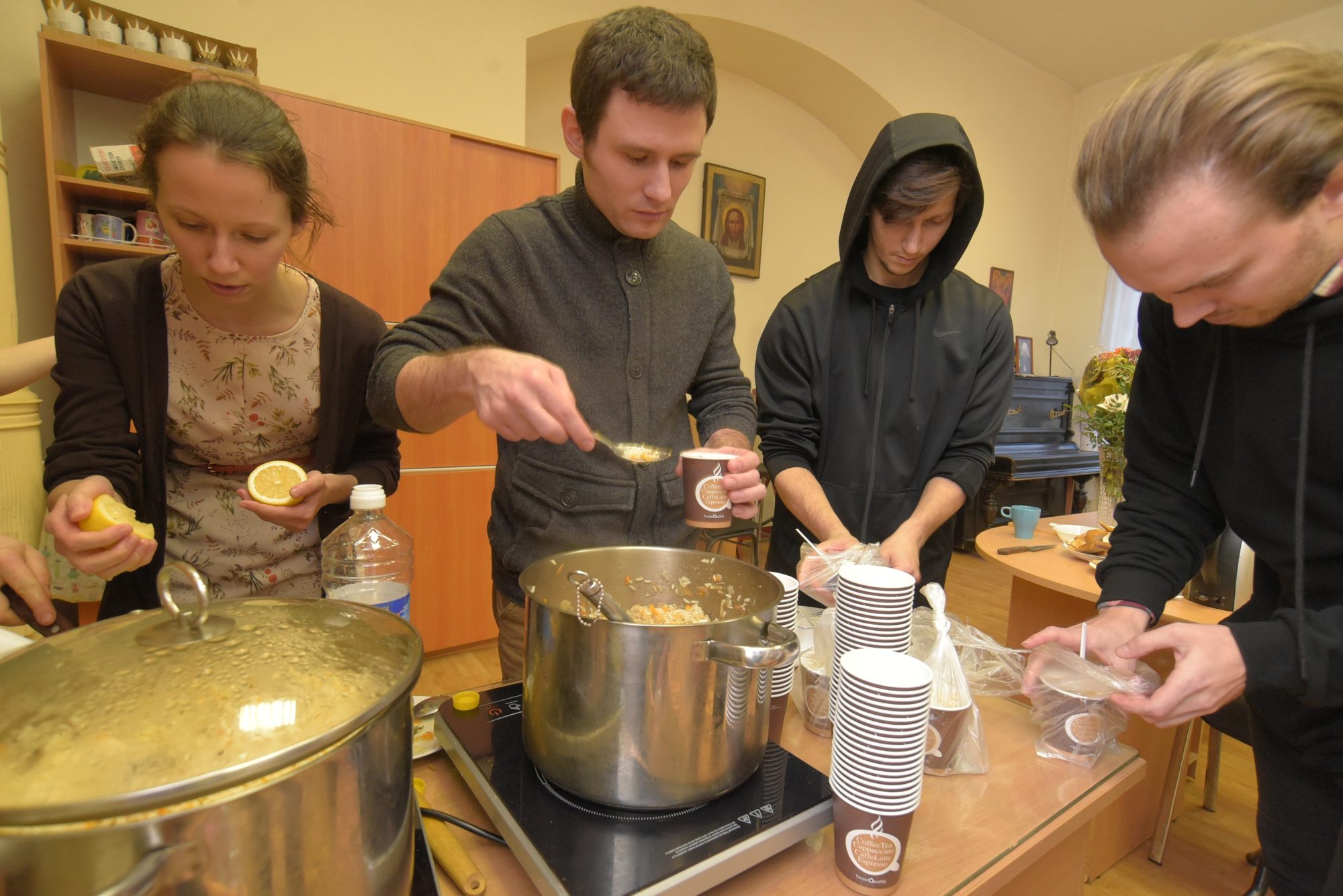 В назначенный час протестанты появляются в трапезной. Они торжественно вручают отцу Димитрию на день рождения разукрашенные смайликами апельсины, вместе радуются удачному сюрпризу. На столах уже разложены бутерброды с колбасой, петропавловская молодежь наполняет пластиковые стаканчики горячим обедом. Перед выходом отец Димитрий читает, а потом толкует фрагмент из «Послания апостолов» о милосердии. Вместе друзья идут по трем маршрутам: Гостинка — Сенная, от Московского вокзала через «Галерею» к Владимирской площади и к месту ночлега для бездомных недалеко от Александро-Невской лавры. В будни людей улиц кормят социальные службы. «Друзья на улице» — в воскресенье.
