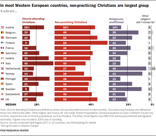 Непрактикующие христиане также превосходят по численности людей без определенной религиозной принадлежности (атеисты, агностики или «индифферентные») в большинстве стран исследования. И даже после недавнего всплеска иммиграции из стран Ближнего Востока и Северной Африки число непрактикующих христиан в Западной Европе значительно превышает количество практикующих верующих (мусульман, иудеев, индуистов, буддистов и др.).