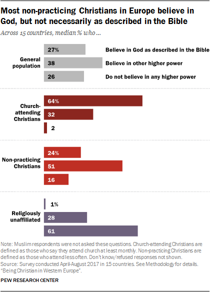 Большинство непрактикующих христиан в Европе верят в Бога. Но их представления о Боге значительно отличаются от тех же представлений христиан, посещающих церковь. В то время как большинство христиан, посещающих церковь, говорят, что они верят в Бога, «как о Нем написано в Библии», непрактикующие христиане верят не в библейский образ Бога, а в некую высшую силу, действующую во Вселенной.