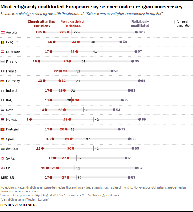 Большинство европейцев без религиозной принадлежности считают, что наука сделала религию ненужной