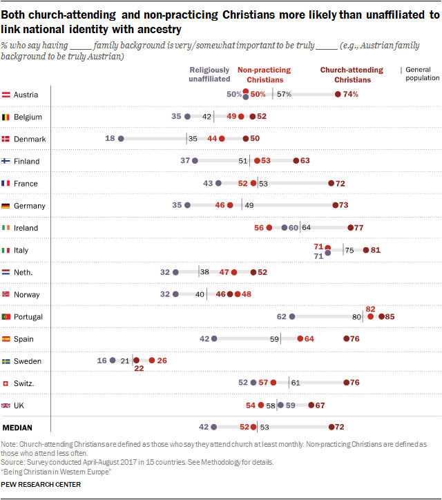 Большинство граждан Италии и Португалии и менее половины Швеции и Дании считают, что, чтобы действительно разделять национальную идентичность, нужно быть гражданином страны в нескольких поколениях (например, чтобы быть настоящим датчанином, нужно иметь датское происхождение).