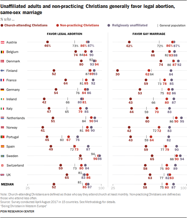 Подавляющее большинство непрактикующих христиан и граждан без определенной религиозной принадлежности по всей Западной Европе поддерживают законные аборты и однополые браки.