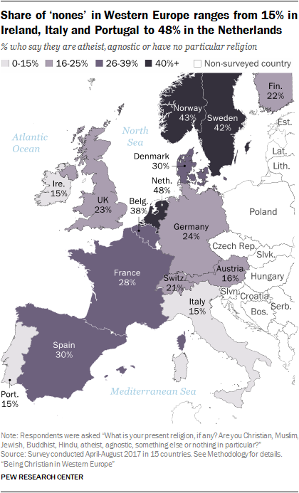 Доля взрослого населения без определенной религиозной принадлежности колеблется от 15% в Ирландии, Италии и Португалии до 48% в Нидерландах