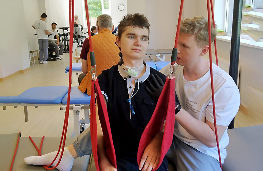 Дважды в день с Филиппом занимаются физкультурой, делают массаж, ставят в вертикализатор. Логопед закрывает трахеостому и учит его дышать. Пока долго не получается — нужны тренировки.