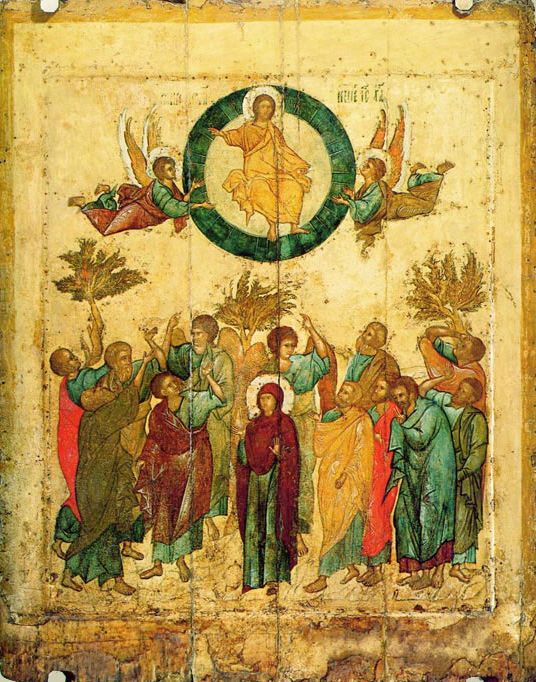 Теперь Спаситель проходит «дверьми затворенными», о чем мы говорили, изучая икону Уверения Фомы, а теперь, на горе Елеонской Он поднимается на Небеса. Пребывая в человеческом теле, в человеческой природе, Он восходит к невидимому, незримому, не имеющему образа Своему Небесному Отцу. И потому так важно, что икона Вознесения построена по законам прямой, земной перспективы, но перспектива эта уводит из земной в Новую, Небесную реальность.