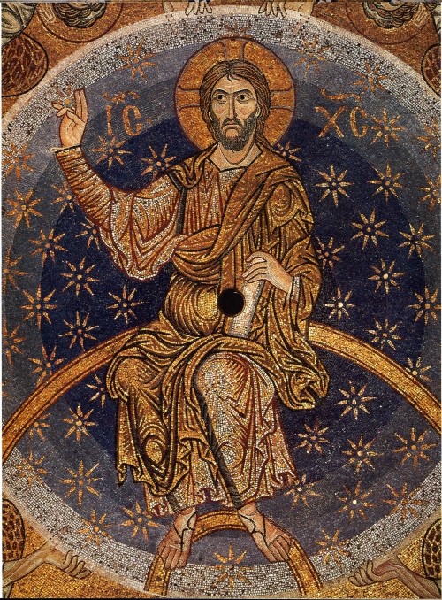 И Спаситель, ходивший по этой, нашей с вами земле, в таких же, как у апостолов, одеждах, на этом образе изображен облеченным в сияющие золотом одежды не земной, а небесной Славы.
