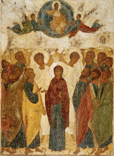 Как мы видим, икона Вознесения – тот случай, когда образ строится по законам не обратной, а прямой перспективы. В создании иконных образов используется и обратная перспектива, и смысловая перспектива, когда главный ее персонаж, главное действующее лицо изображается крупнее, а остальные рядом с ним – мельче.