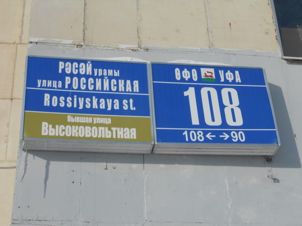 Такую же картину можно увидеть и на некоторых улицах Уфы. Таблички на домах, расположенных на улице Российской, двойные: на них указано, что до этого улица носила название Высоковольтной.