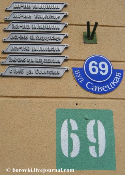 А белорусский город Барановичи прославился домом №69 по улице Советской (она пока своего названия не поменяла). На стене дома — целых 7 табличек с наименованиями. По ним можно изучать историю улицы.