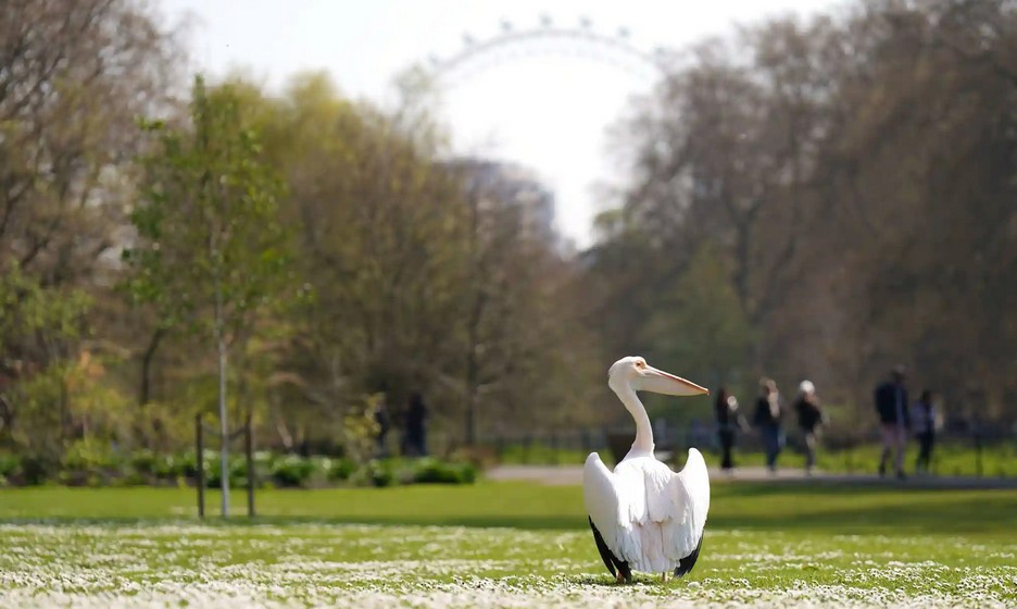 Пеликан греется под весенним солнцем в лондонском парке Сент-Джеймс. Фото: Джеймс Мэннинг/Пенсильвания