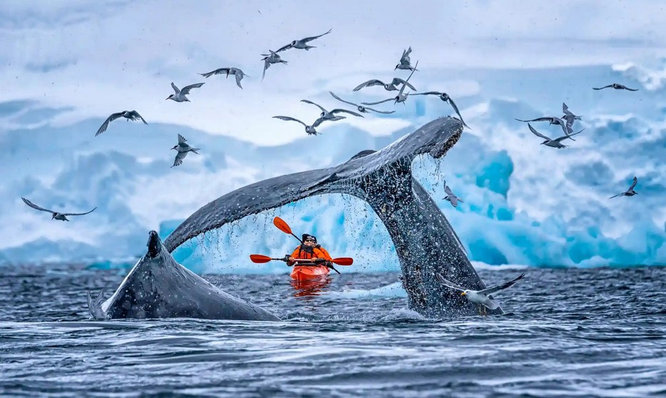 «Перезвоню! Меня тут кит подрезал, чайки — в шоке!» Пара каноистов наблюдают за китами в Антарктиде. Фото: Jiahong Zeng/Solent News & Photo Agency/Solent News