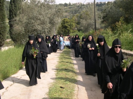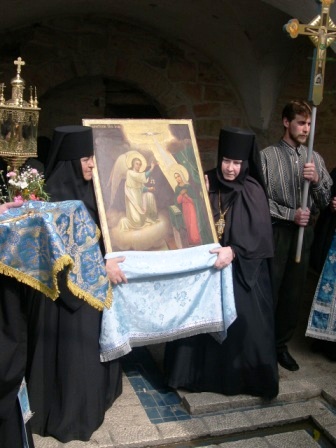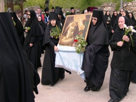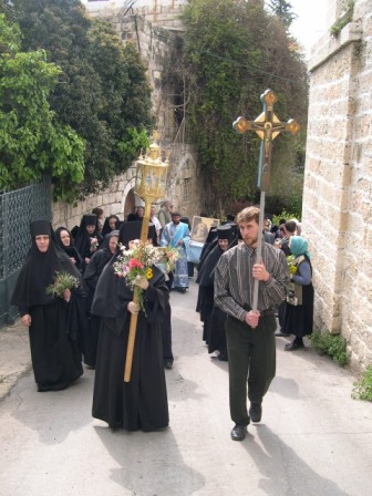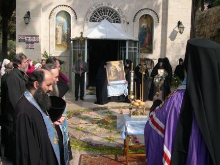У древнего источника в Айн-Кареме, где Матерь Божия брала воду во время своего трехмесячного пребывания в Горней, игумения Георгия с иконой Встречи Пречистой Марии с праведной Елизаветой в окружении сестер Горненского монастыря встретила икону Благовещения. Затем было прочитано Евангелие об этом событии и началась Лития в процессии по пути в Горнюю обитель.