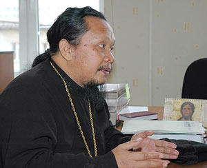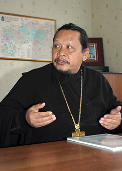 Когда мы начинали, то каждое воскресенье я брал всё необходимое для службы с собой, и мы шли в какой-нибудь дом, где было большое помещение, там всё раскладывали и начинали служить. И так, в принципе, продолжается до сего дня. Но сейчас немного лучше, потому что мы арендуем дом для богослужений. Но после службы надо всё-всё убирать, потому что туда заходят другие люди, в том числе дети. В шесть утра в воскресенье я уже начинаю готовить комнату к службе, устраиваю алтарь и всё прочее. А в семь начинают приходить верующие. Служу в Джакарте и в Суравае. В обоих местах – приход во имя святого Владимира. Всего у нас более семидесяти прихожан, но на службы приходит немного, поскольку у нас нет храма, и мы молимся в доме, так что большие собрания могут привлекать излишнее внимание соседей. Проблема в том, что согласно индонезийским законам нельзя устраивать богослужения на квартирах или в домах, только в специальных религиозных зданиях, в храмах. У нас уже есть в Джакарте земля для постройки храма, но, к сожалению, нет денег на строительство храма.