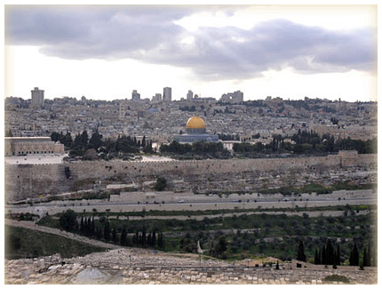 С Елеонской горы открывается прекрасная панорама Иерусалима – святого города для представителей трех мировых религий: христианства, иудаизма и ислама. Уже при внешнем осмотре столицы удивляешься невообразимому смешению эпох, культур и стилей. Слева – каменные руины времен Первого и Второго Храмов. Правее видны два серых купола храма Воскресения эпохи крестоносцев. Все это опоясано зубчатой крепостной стеной с черными бойницами, сложенной из могучих известняковых блоков. Это уже постарались турки-османы, правившие Палестиной добрых четыре сотни лет. Плоские крыши синагог соседствуют с шатрами церквей и стройными как кипарисы мечетями. Среди массива жилых кварталов в обрамлении деревьев «священного сада» — «Харам аш Шариф» на Храмовой горе возвышается огромная золотая сфера. Она покоится на отливающем смальтой голубом восьмиугольнике. Это мечеть Омара или «Купол Скалы», самый величественный монумент Иерусалима и Ближнего Востока. Раньше здесь стоял не менее впечатляющий Соломонов храм, в котором проповедовали ветхозаветные пророки, предвозвещая пришествие в мир Сына Божия. Старый город-крепость нависает над покрытой оливковыми деревьями и древними надгробиями долиной Иосафата, местом Страшного суда.