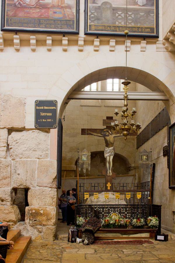 А вот очень важное место: Александровское подворье Императорского Православного Палестинского Общества, самое близкое к Храму Гроба Господня русское владение, именующееся также Русскими раскопками. Императоры всячески стремились быть причастными Святой Земле, но раздел, скажем так, имущества произошёл до них. И каково же было удивление, когда на этом клочке земли при проведении раскопок было обнаружено огромное количество древних построек, в том числе фрагмент второй обводной иерусалимской стены с Порогом Судных Врат: порог древних ворот, через которые точно переступал Иисус Христос в ту самую Пятницу.