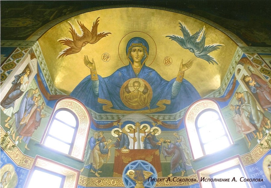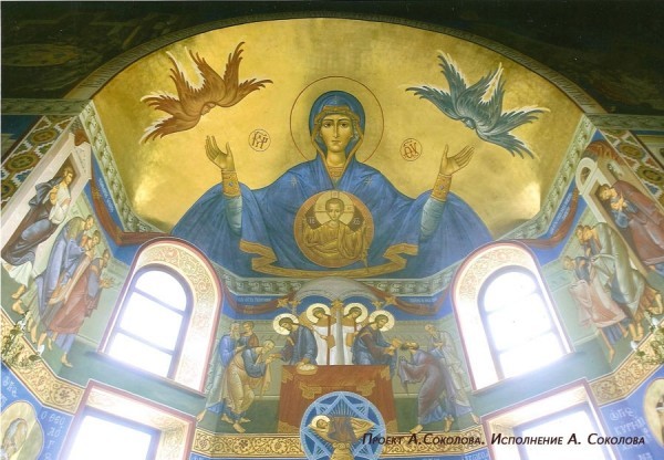 Восстановление храмов часто ставит своей целью, чтобы обстановка этого храма была точно воссоздана, тем более если это памятник архитектуры. Но Александр Соколов этим не ограничился. Он сделал прекрасные фрески на фасадах этого храма, например, храмовый образ Богоматери “Живоносный источник” на алтарной стене.