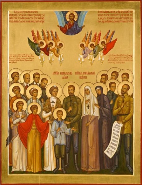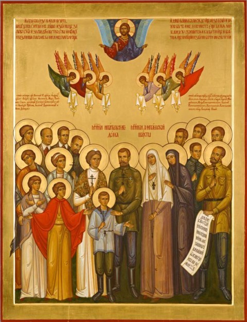 Хочется обратить внимание на одну из икон, которая стоит в киоте. Здесь мы тоже видим определенную тенденцию, которая, может быть, пока не главная, но она должна победить многие отрицательные тенденции, которые сегодня видны в новых образах. Это икона посвящена новомученикам, жертвам Алапаевска и Ипатьевского дома. Тут мы видим не только царскую семью и великую княгиню Елизавету Федоровну с ее келейницей Варварой, но и тех, кто был в Алапаевске вместе с ними сброшен в шахту, и всех, кто не покинул Ипатьевский дом в Екатеринбурге, хотя им была предоставлена такая возможность, а остался верен не только государю, но и Христу, понимая, что в данный момент речь идет уже не о политике.