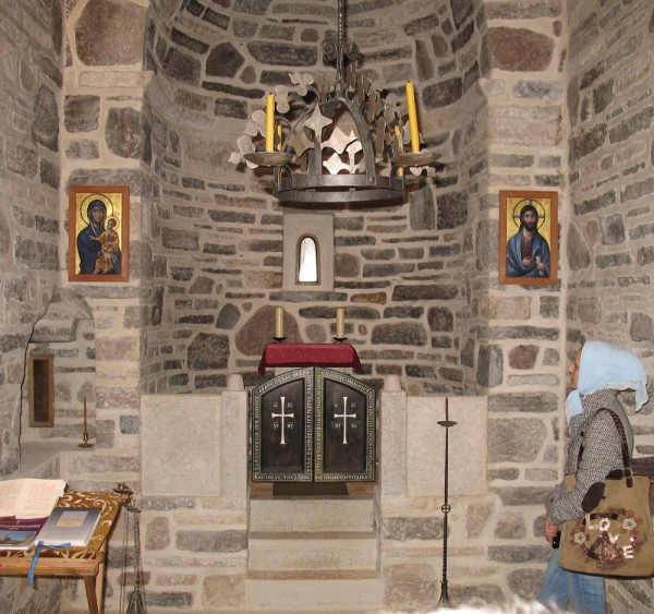 Например, образ Христа Ника — необычный, пришедший к нам из VI века. И рядом прекрасная и нежная Богородица. И вторым рядом — круглые медальоны с образами святых. Святой Стефан, святой Исаак Сирин и еще ряд святых. Такой скромный, аскетичный, настойщий монашеский иконостас. Братия этого монастыря составляла человек пять-шесть, но все они были либо иконописцами, либо теми, кто делает доски, в общем связаны были с иконописным искусством. Предполагалось, что этот монастырь будет служить развитию иконописной традиции. Увы, не получилось.