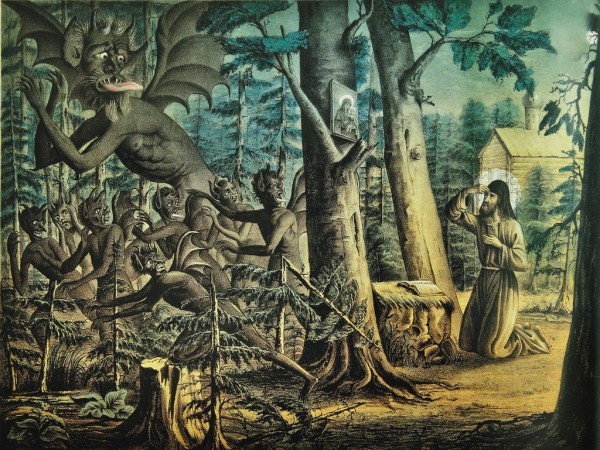 Следующее клеймо — изгнание бесов молитвами преподобного: однажды преподобный Сергий ночью вошел в церковь на молитву, и когда он начал пение, внезапно стена церкви расступилась и вошло видимым образом множество бесов; они бросились на блаженного, скрежеща зубами и угрожая убить его. Преподобный, имея упование на Бога, творил усердную, со слезами молитву против врагов; вскоре Божественная сила внезапно осенила его и вмиг рассеяла лукавых духов.