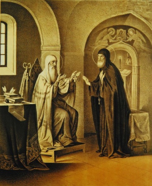 Необходимо упомянуть здесь и знаменитую икону святителя Алексия, Митрополита Московского с житием, написанную в конце XV — начале XVI вв. Дионисием для Успенского собора Московского Кремля (ныне в ГТГ). Здесь заслуживают внимания два клейма, связанные со взаимоотношениями святителя и преподобного. На седьмом клейме святитель Алексий просит преподобного Сергия отпустить его ученика Андроника на игуменство в Спасский (ныне Спасо-Андроников) монастырь, который свт. Алексий основал в 1361 г. на высоком берегу реки Яузы в Москве. Перед сидящим святителем стоит преподобный Сергий и сопровождающие его два Троицких монаха; преподобный смиренно принимает первосвятительское благословение (Блаженный не отверг просьбу святителя и отпустил с ним Андроника, говорится в Житии). На тринадцатом клейме Митрополит Алексий, чувствуя приближение своей кончины, призывает преподобного Сергия на первосвятительское служение. Преподобный сидит в мантии на широком седалище напротив святителя Алексия, Митрополит — на святительском престоле; между ними возвышается киворий… По великому смирению своему преподобный Сергий не принял предложения, и Митрополит Алексий, утешив преподобного духовными назиданиями, отпустил его в свой монастырь. Этот сюжет очень точно воспроизводится в миниатюрах Лицевого жития преподобного Сергия XVI в. (Российская государственная библиотека).