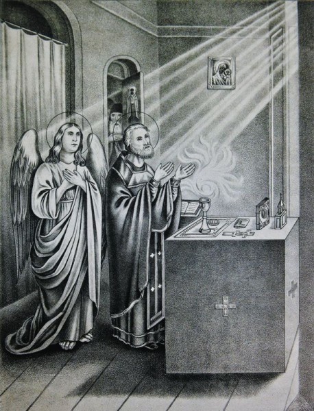 Клеймо «Служение Божественной литургии преподобным Сергием с Ангелом» иллюстрирует следующий рассказ Жития. Однажды преподобный Сергий служил Литургию вместе со своим родным братом Стефаном и племянником епископом Феодором. Молившимся в храме монахам Исаакию молчальнику и Макарию было видение в алтаре четвертого священнослужителя — сияющего необычайным светом, в блистающих ризах. Иноки поняли, что святому Сергию сослужил Ангел Божий.