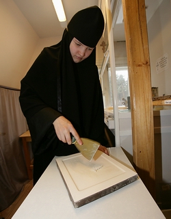 Процесс этот далеко не прост. Сначала особым образом просушиваются заготовки из липы, кедра и сосны. После сбора доски из брусочков, идеально подходящих друг к другу (учитывается даже направление волокон!), на поверхность наклеивается ткань – паволока – из льна или хлопка. Затем, после высыхания, наносится особый грунт – левкас. Его делают сами сестры здесь же в монастыре из мела с добавлением клея. Получается совершенно ровная белая поверхность, и вот только тогда с предварительного карандашного рисунка и начинается собственно письмо.