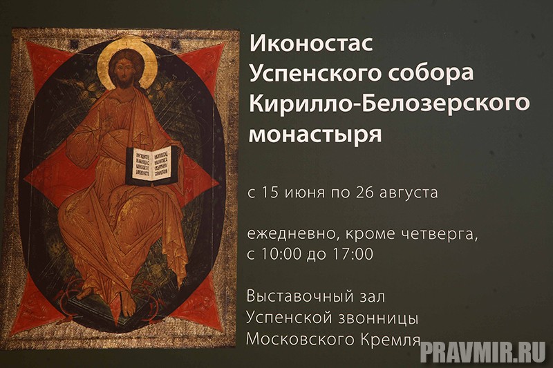 В Московском Кремле проходит экспозиция иконостаса Успенского собора Кирилло-Белозерского монастыря. 58 икон из 4 музеев — Третьяковки, Русского музея, музея Андрея Рублёва и музея Кирилло-Белозерского монастыря собраны в иконостас и выставлены в Кремле.