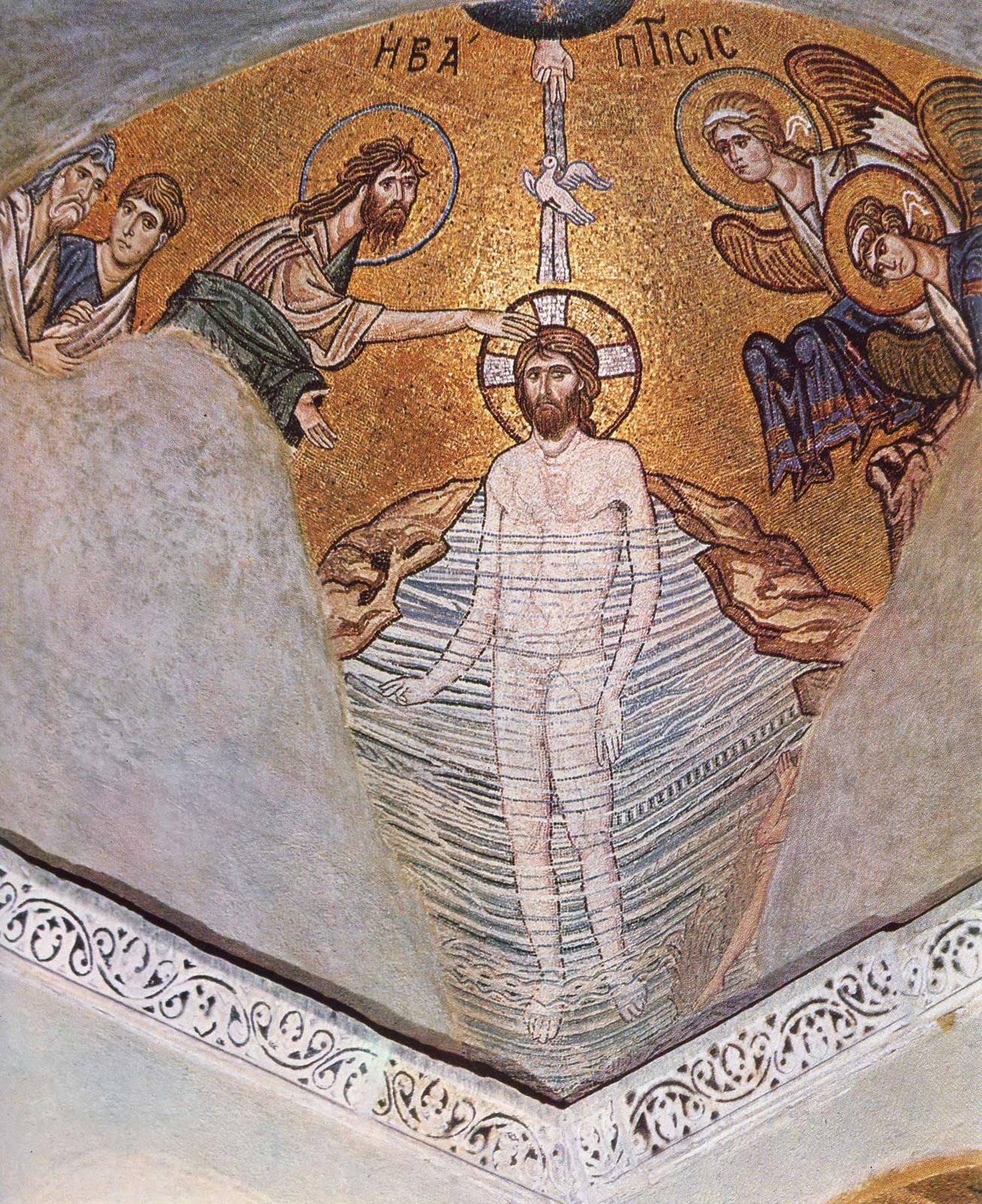 Из ранних изображений Крещения Господня наибольший интерес представляют Равеннские мозаики V-VI вв. В куполе Православного баптистерия Крещение Господне имеет сложную иконографию: Спаситель представлен обнаженным, с власами назорейской длины, с бородой, с опущенными вниз руками; Он стоит по пояс в воде, а сверху на Него спускается Дух Святый в виде голубя.