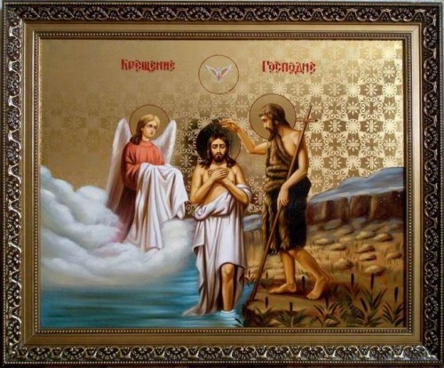 Обнаженный Спаситель полностью погружен в воды Иорданские; Он находится в движении: видно, что Он только что вошел, и тотчас выходит (взыде абие от воды – Мф. 3:17); Предтеча, облаченный в одежду из верблюжьего волоса (Мф. 3:4), стоя на берегу, протягивает к Спасителю руку, исполняя всякую правду. На противоположном берегу Иордана – благоговейно склонившиеся ангелы подают выходящему из воды Иисусу одежды…