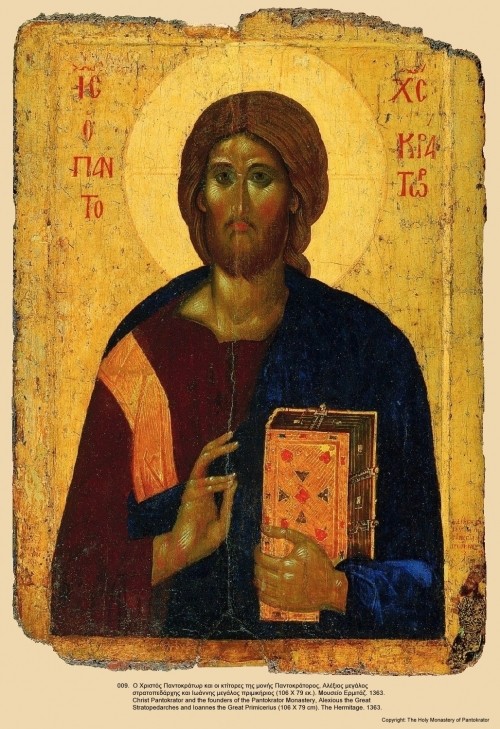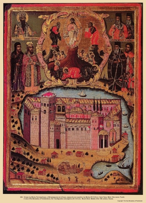 Преображение, с ктиторами монастыря Пантократор с видом самого монастыря