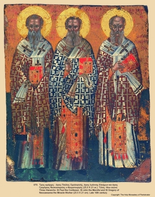 Три святителя: св. Павел Исповедник, св. Иоанн Милостивый, св. Георгий Неокесарийский. Конец XVI в.