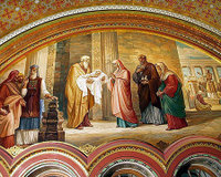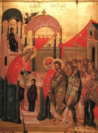 Девочке всего три года. Как милы малютки в это время, как чисты и невинны! Как ласкает родительское сердце один вид их! Но где лучше сохранить и укрепить эту чистоту? В храме. Иоаким и Анна отдали Марию на воспитание в храм. Смотрите, родители, и ваше дитя должно чтить Закон Божий, и вашему ребенку необходимо быть в храме. Взирая на этот образ родительского подвига и надежды на Бога, молитесь о своих чадах, размышляйте о своих обязанностях.