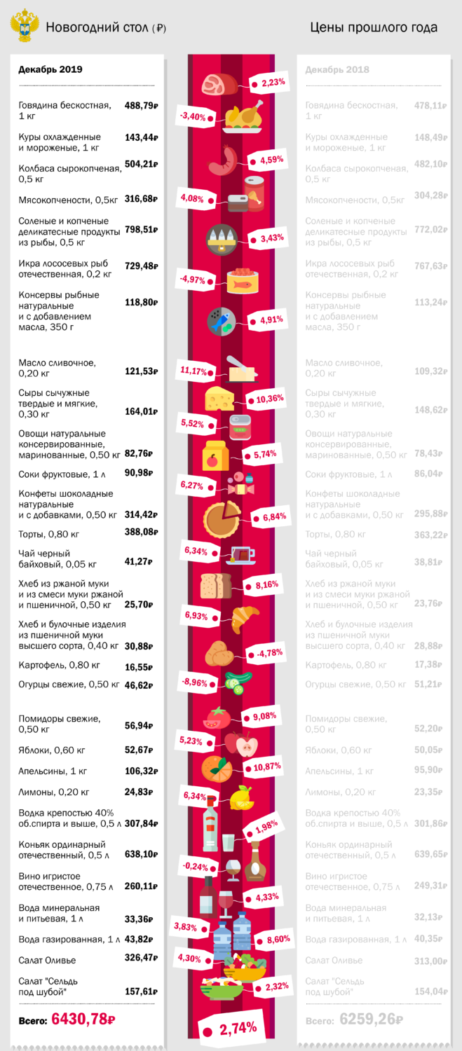 43% от общего бюджета, или 8 299 рублей, россияне потратят на еду и напитки к новогоднему столу. Традиционные блюда на нем — оливье и селедка под шубой — продолжают дорожать. По данным Росстата, за год стоимость продуктов для оливье выросла на 4,6%.