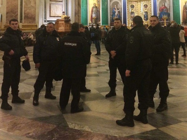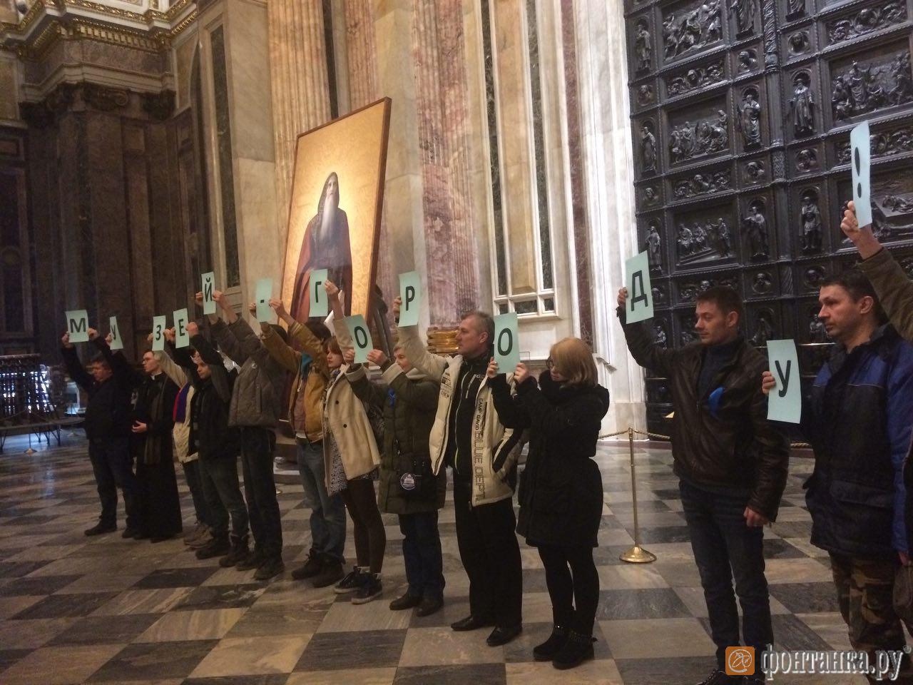 По мнению организаторов акции в храме, полиция, узнав о предстоящем мероприятии внутри собора, попросила администрацию музея его закрыть. Якобы, в соборе в это время начали «экстренно проводить службу». Однако, вечернее богослужение проводилось по постоянному расписанию, в 16.00.