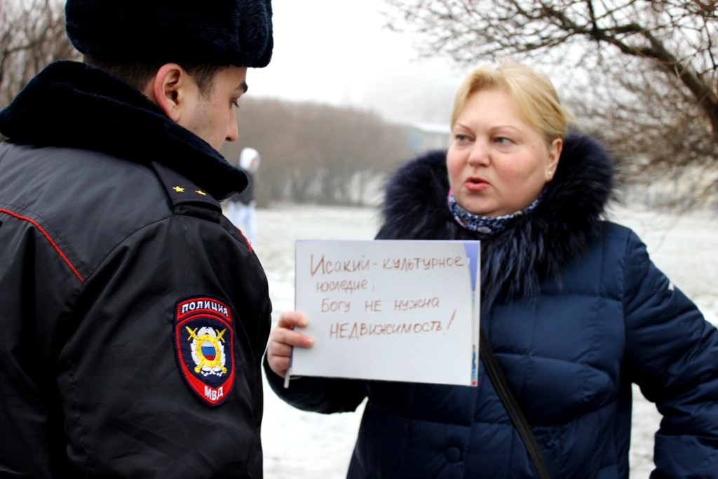 Между молящимися и участниками акции, разместившимися в противоположных сторонах собора, курсировали журналисты, музейные работники и сотрудники полиции, которые пришли сюда с ОМОНом.