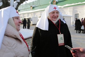 Наталья и Иоанна, сестры милосердия киевского Сестричества при храме Архистратига Михаила в Медгородке: «Мы как волонтеры обеспечиваем подход паломников к храму. Передвигаемся вдоль очереди и встречаем пожилых людей, беременных женщин, а также паломников с детьми. Учитывая человеческие немощи, пропускаем этих людей к святыне без очереди. Невзирая на мороз и обилие людей, усталости не ощущается. Мы и сами приложились к Дарам. Настолько радостно на сердце и тепло на душе! Хочется со всеми поделиться этим, хочется всех обогреть, сказать доброе слово, обнять. Народ благодарит за заботу. Вот меня сегодня даже два раза поцеловали. Люди у нас замечательные!»