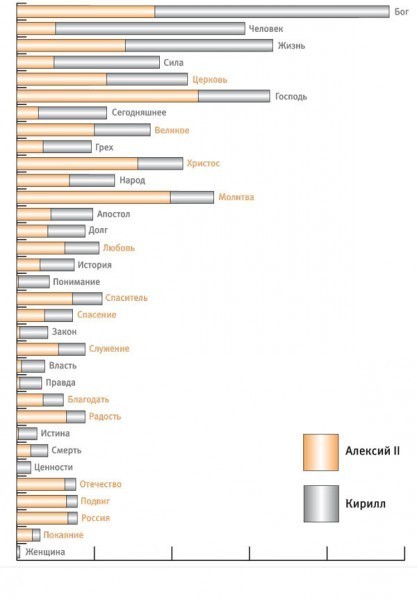 А вот о человеке Патриарх Кирилл упоминает почти в пять раз чаще, чем это делал патриарх Алексий. Слово «человек» во всех словоформах оказалось не единственным примером столь большого разрыва по числу упоминаний между двумя патриархами.