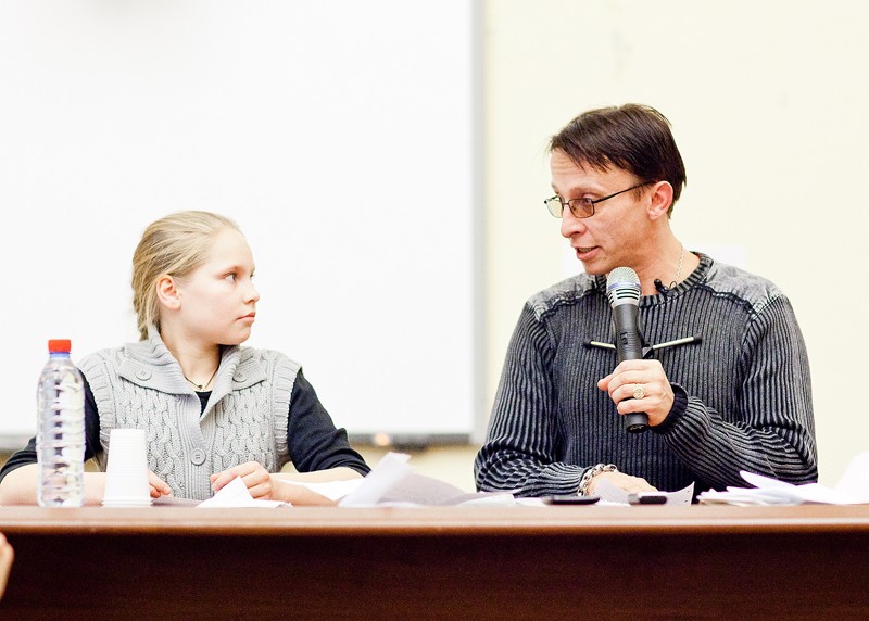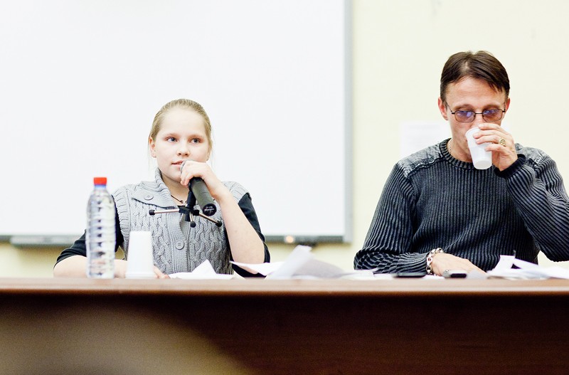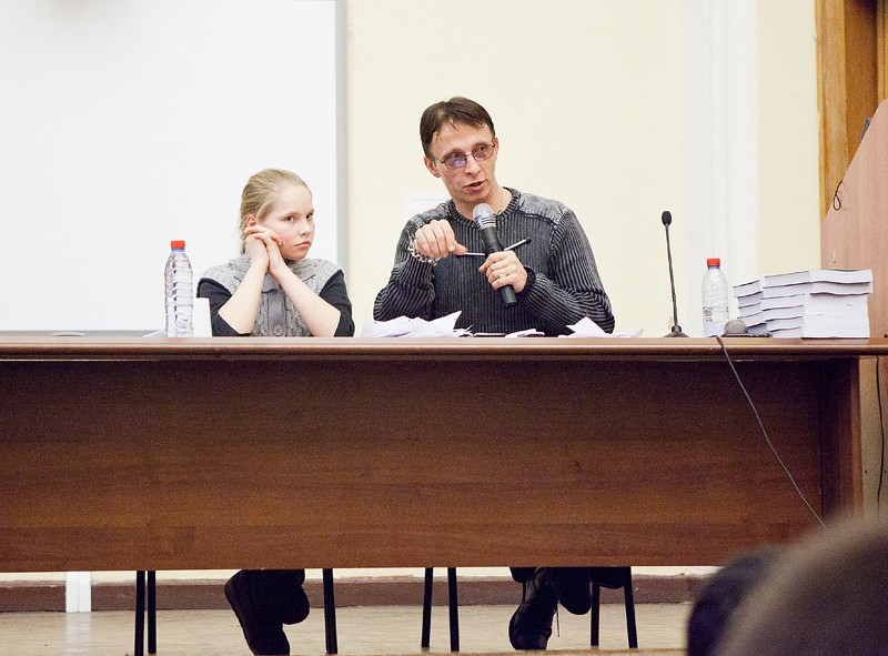 232 аудитория, где проходил вечер, была забита – студенты стояли в проходах, сидели на полу, толпились у сцены. «Яркая, многогранная и во многом неоднозначная личность», как было заявлено в анонсе, пришла на встречу не одна. Вместе с Иваном Охлобыстиным на сцену поднялась и его дочь Варвара. Она также отвечала на вопросы – как отца, так и аудитории, помогала разбирать кипы приходящих с вопросами записок. Из зала на своего супруга и дочь смотрела Оксана Охлобыстина. Хотя об этом, похоже, никто не догадывался.