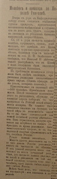 Вчера с утра к Кафедральному собору стали стекаться отдельные группы граждан, привлеченные анонимными извещениями и слухами, что в этот день будет отслужена панихида по убиенном бывшем императоре всероссийском.